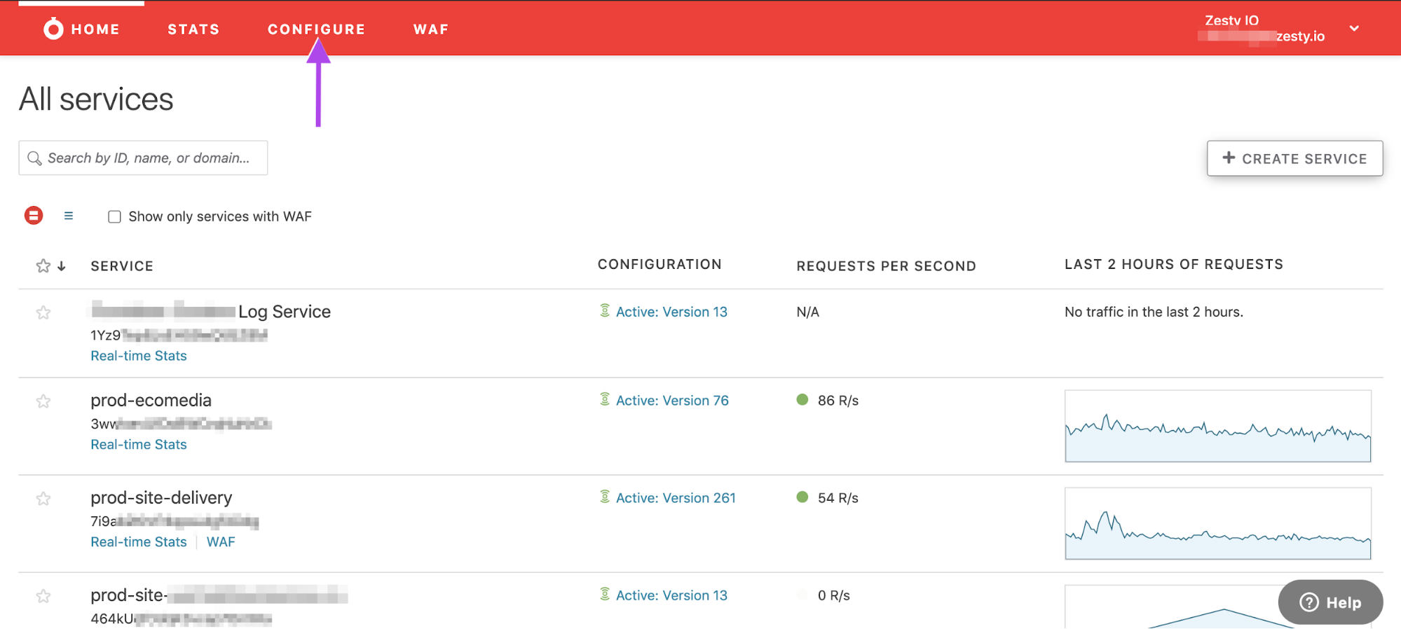 1. After you sign in to Fastly, select Configure from the main menu. Ensure you’re on prod-site-delivery.